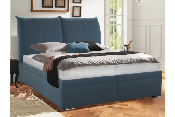 Luxusní manželská postel o velikosti lůžka 180×200 cm zaujme měkoučkým polštářovým čelem, které přispívá k pocitu útulnosti a pohodlí. Postel je očalouněna tkaninou v šedomodrém odstínu. Váš komfortní spánek se postarají rošty s funkcí polohování a kvalitní vysoké matrace, díky nimž bude vstávání z vyššího lůžka snazší. Úložné prostory v dolní části překvapí nečekaným objemem – ten využijete při ukládání lůžkovin, prádla nebo třeba sezónních věcí.