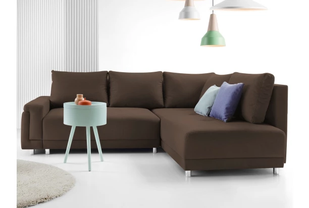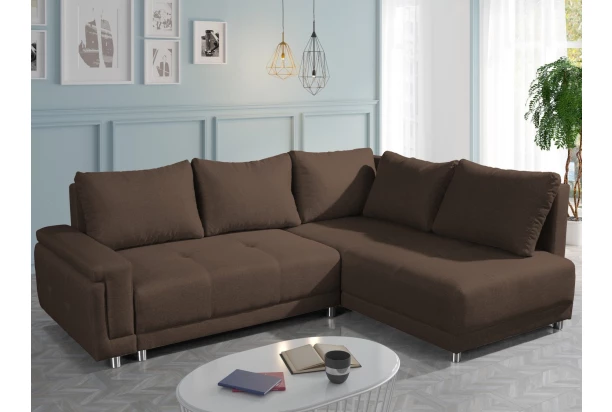Rohová sedací souprava s pravým otomanem pasuje svými ideálními rozměry do mnoha interierů. Zajímavě tvarovaná područka, prakticky řešený design a příjemně pohodlné sezení s velkými opěrnými polštáři si snadno oblíbíte. Očalouněna látkou v odstínu hnědá.