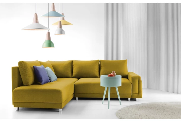 Rohová sedací souprava s levým otomanem pasuje svými ideálními rozměry do mnoha interierů. Zajímavě tvarovaná područka, prakticky řešený design a příjemně pohodlné sezení s velkými opěrnými polštáři si snadno oblíbíte. Očalouněna látkou v odstínu hořčicová žlutá.