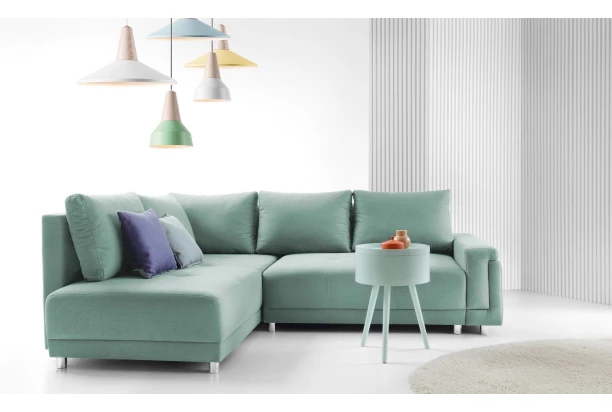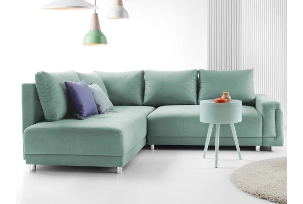 Rohová sedací souprava s levým otomanem pasuje svými ideálními rozměry do mnoha interierů. Zajímavě tvarovaná područka, prakticky řešený design a příjemně pohodlné sezení s velkými opěrnými polštáři si snadno oblíbíte. Očalouněna látkou v odstínu mentolově zelená.