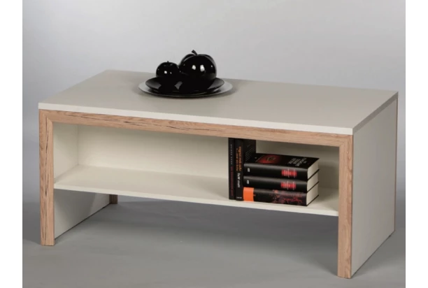 Moderní konferenční stolek z kolekce Prag. Čisté bílé linie dokreslují ozdobné zešikmené rámy v dekoru dubového dřeva. Oceníte i prostorné boční úložné přihrádky.