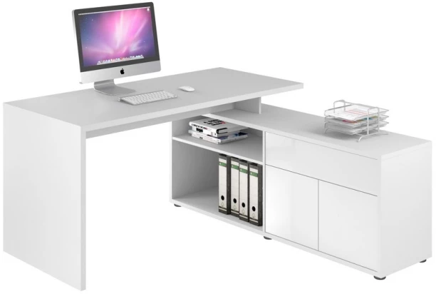 Prostorný rohový psací stůl v kombinaci bílého matu a bílého lesku má kvalitní konstrukci se zesílenou pracovní deskou a boční úložnou skříňku s univerzální montáží vpravo nebo vlevo.
