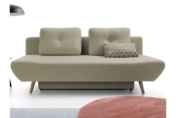 Zaoblená rozkládací pohovka v atraktivním skandinávském stylu obsahuje opěrné polštáře, dřevěné nohy, funkci rozkladu i úložný prostor pod sedákem. Očalouněna látkou v béžové barvě.