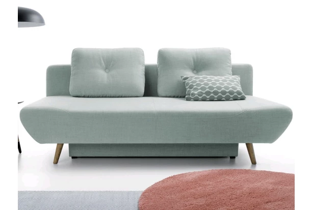 Zaoblená rozkládací pohovka v atraktivním skandinávském stylu obsahuje opěrné polštáře, dřevěné nohy, funkci rozkladu i úložný prostor pod sedákem. Očalouněna látkou ve světle šedé barvě.