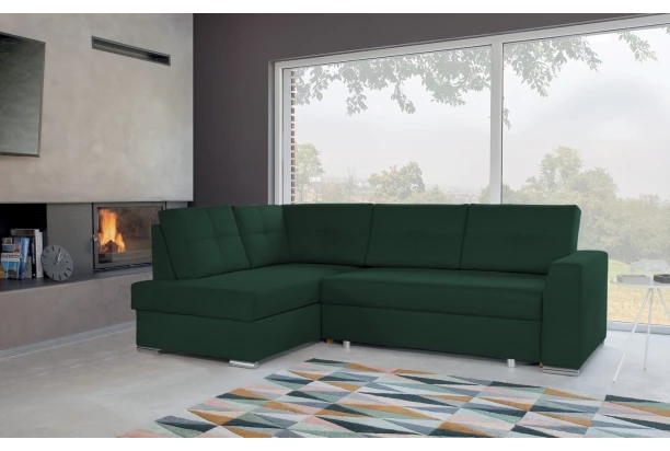 Sympaticky tvarovaná rohová sedací souprava s otomanem vytváří levý roh. Očalouněna jemně strukturovanou látkou v barvě lahvově zelená. Obsahuje úložný prostor i funkci rozkladu na lůžko, které je možné využívat i pro trvalé spaní.