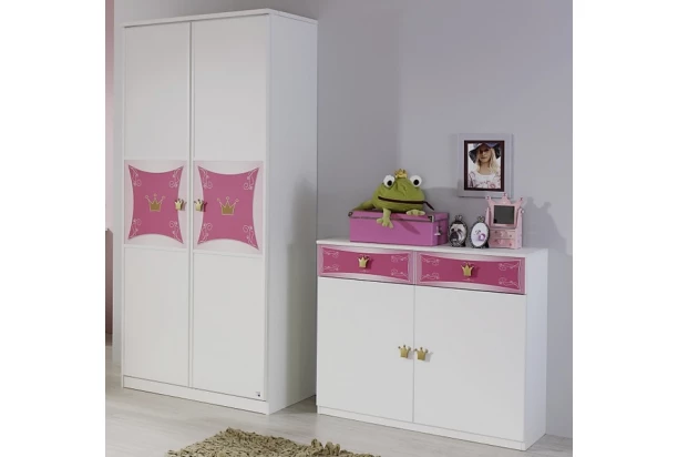 Šatní 2-dveřovou skříň z dětské kolekce Kate si zamilují malé i velké princezny. Nábytek s růžovými aplikacemi a motivem princeznovské koruny je skvělou inspirací pro zařízení dětského pokoje pro holky. Dopřejte tak svým dětem prožít si svůj sen v jejich vlastním dětském království.