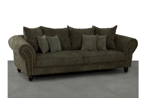 Velká pohovka v noblesním chesterfield stylu je velmi velmi oblíbená a zaujme na pohled. Komfortní polštáře v různých velikostech doplňují masivní tvarované nohy a okrasné kovové cvočky, které dotváří jedinečný vzhled. Tato široká pohovka je očalouněna kombinací zelené strukturované látky a zelené látky se zajímavou proužkovanou strukturou.