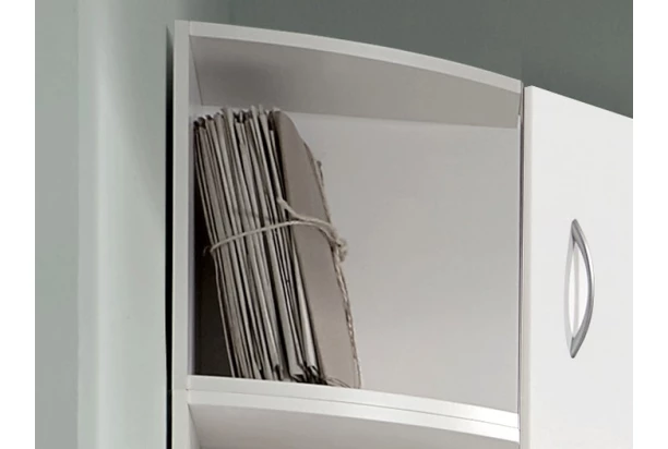 Nástavný rohový regál v bílé barvě z víceúčelového programu Multiraum. Kombinováním různých dílů můžete snadno zařídit jakoukoliv místnost vašeho bytu.