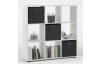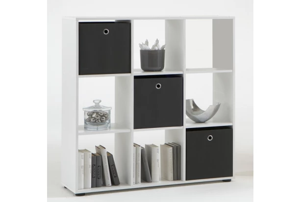 Regál s 9 přihrádkami může být umístěn ke stěně nebo volně v prostoru. Vyroben v bílé barvě.