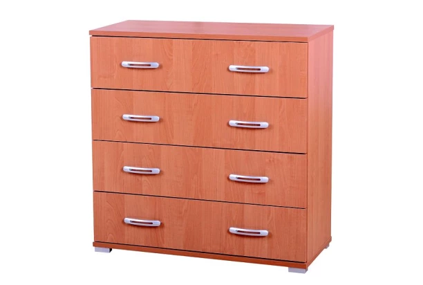 Klasická zásuvková komoda v dekoru olše. Celkem 4 široké zásuvky nad sebou s výraznými úchyty v barvě stříbrná.