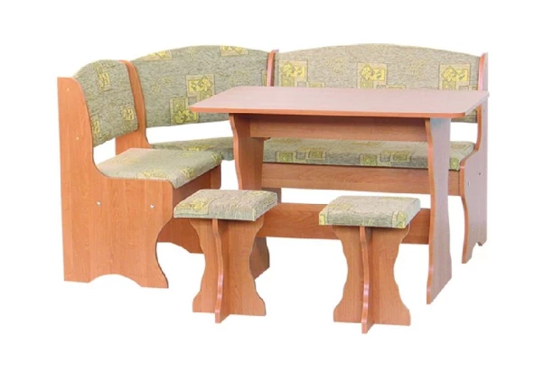 Skládající se z rohové lavice, stolu a 2 stoliček. V dekoru olše, sedací a opěrné části polstrované látkou se vzorem.