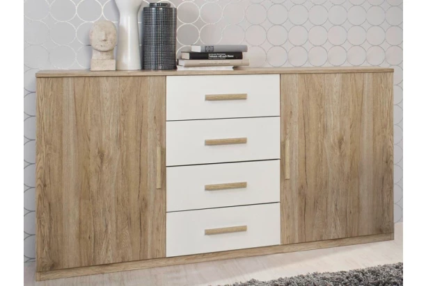 Komoda o šířce 140 cm z kolekce Mosbach v kombinaci dubu san remo a bílé barvy. Středové zásuvky a boční dveře doplní úložná místa v jakékoliv místnosti.