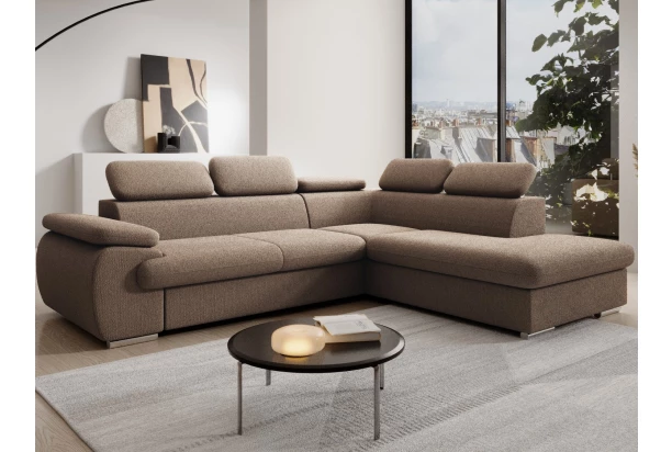 Atraktivní rohová sedací souprava s otomanem vpravo a polohovatelnými zádovými opěrkami. Očalouněna příjemně měkkou látkou v barvě světle hnědá. Zaujme moderním designem zaoblených tvarů a potěší kvalitním vypolstrováním pro Váš každodenní komfort. Sedačka je navíc vybavena funkcí rozkladu pro příležitostné spaní i praktickým úložným prostorem pod otomanem – získáte tak další místo pro ukládání věcí.
