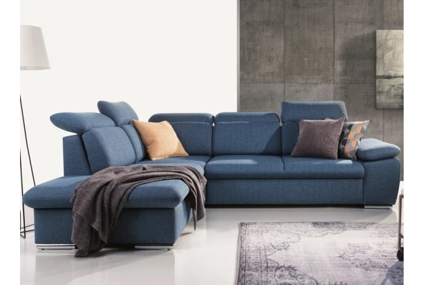 Elegantní rohová sedací souprava s komfortně měkkým sezením a polohovatelnými opěrkami hlavy nabízí skvělé pohodlí i praktičnost. Varianta s otomanem vlevo. Očalouněna tkaninou v odstínu denimově modrá.