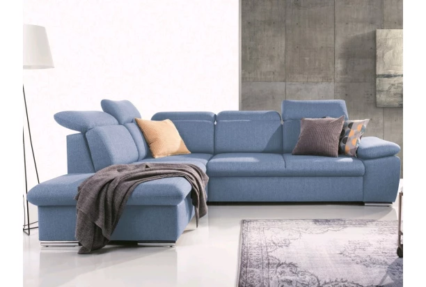 Elegantní rohová sedací souprava s komfortně měkkým sezením a polohovatelnými opěrkami hlavy nabízí skvělé pohodlí i praktičnost. Varianta s otomanem vlevo. Očalouněna tkaninou v modrém odstínu.