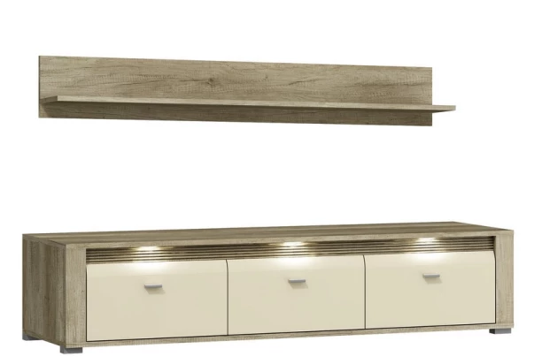 TV stolek s nástěnnou policí z elegantního programu Campari je vyroben v kombinaci divokého dubu a krémového lesku. Dekorativní vodorovná lišta s vyfrézovanou profilací přidává na zajímavosti.