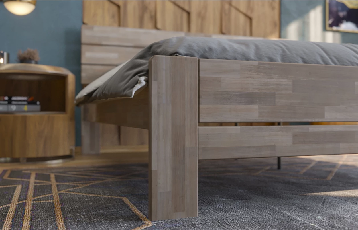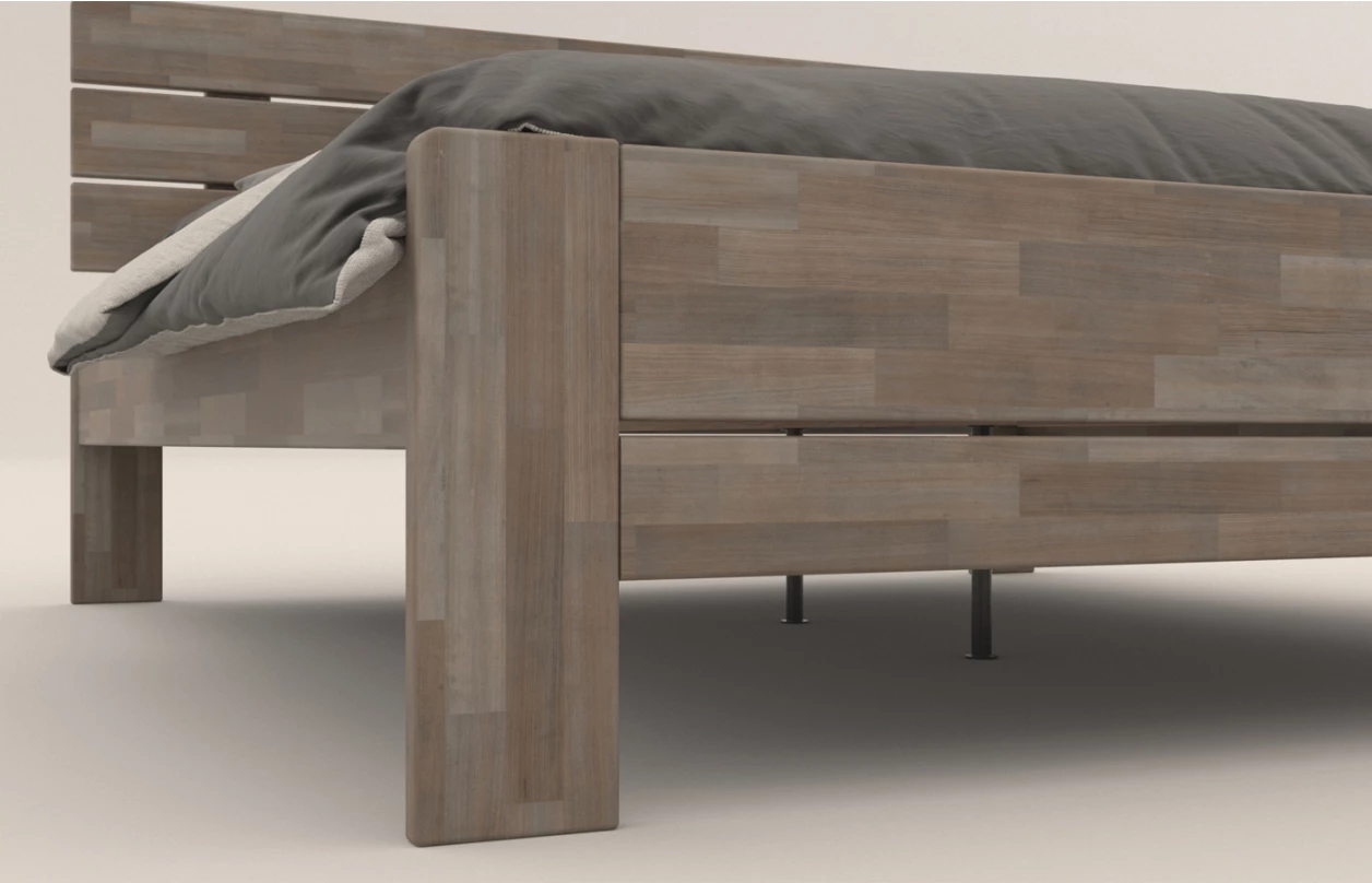 - rohové spoje postelového rámu: tradiční a velice pevné rohové spojení systémem závrtné matice a šroubového táhla s přídavnými kolíky – takové rohové spojení u celomasivní postele lze právem považovat za nejpevnější a nejodolnější vůči dynamickému zatížení postele