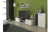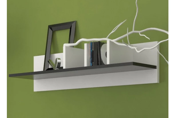 Jednoduchá polička v bílo-černém kontrastním provedení může být zavěšena samostatně nebo jako součást obývací sestavy.