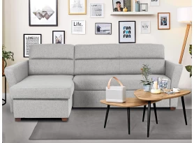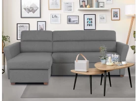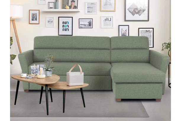 Přímočaré linie a zajímavě zkosené tvary područek dávají této sedačce moderní charakter. Varianta rohové sedací soupravy s otomanem vpravo je očalouněna látkou v barvě rákosově zelená. Oceníte také funkci rozkladu a úložný prostor.
