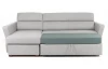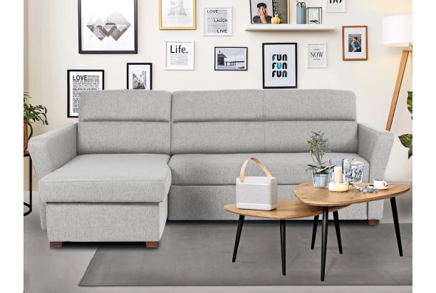 Přímočaré linie a zajímavě zkosené tvary područek dávají této sedačce moderní charakter. Varianta rohové sedací soupravy s otomanem vlevo tvoří levý roh je očalouněna látkou v barvě světle šedá. Oceníte úložný prostor a funkci rozkladu pro příležitostné i trvalé spaní.
