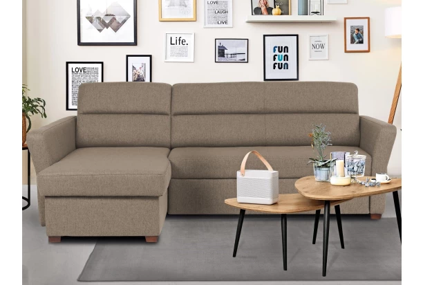 Přímočaré linie a zajímavě zkosené tvary područek dávají této sedačce moderní charakter. Varianta rohové sedací soupravy s otomanem vlevo tvoří levý roh je očalouněna látkou v barvě světle hnědá. Oceníte úložný prostor a funkci rozkladu pro příležitostné i trvalé spaní.