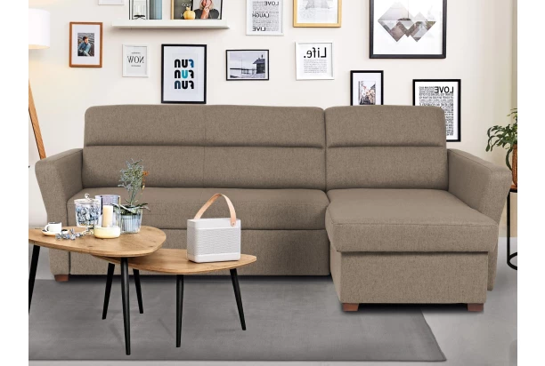 Přímočaré linie a zajímavě zkosené tvary područek dávají této sedačce moderní charakter. Varianta rohové sedací soupravy s otomanem vpravo tvoří pravý roh je očalouněna látkou v barvě světle hnědá. Oceníte úložný prostor a funkci rozkladu pro příležitostné i trvalé spaní.