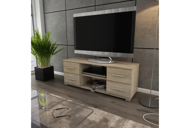 TV stolek o šířce 120 cm obsahuje přihrádky pro elektroniku i 4 zásuvky pro uschování drobností. V dubovém dekoru sonoma.