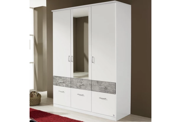 Šatní skříň ze série Bremen je oblíbená pro svou praktičnost a dobrou úroveň zpracování. Vyrobena v kombinaci bílé barvy a imitace šedého betonu. Nabízí úložný prostor, 3 otočné dveře, 1 zrcadlo a 6 praktických zásuvek o různých velikostech pro přehledné ukládání oblečení, prádla a doplňků. Z jednotlivých elementů série Bremen můžete navíc sestavit libovolně velkou šatnu a přizpůsobit si tak úložné prostory podle individuálních potřeb.