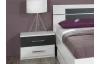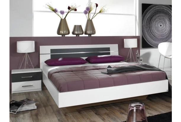 Postel s nočními stolky o rozměru lůžka 160×200 cm z ložnicového programu Burano v kontrastní kombinaci bílá/tmavě šedá. Zadní čelo doplněno dekorativním pruhem v barvě lesklého chromu.