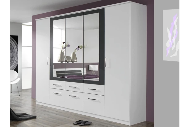 Šatní skříň o šířce 225 cm z ložnicového programu Burano v kontrastní kombinaci bílá/tmavě šedá. Dveře se zrcadly doplňují dvě řady praktických úložných zásuvek pro přehledné ukládání prádla.