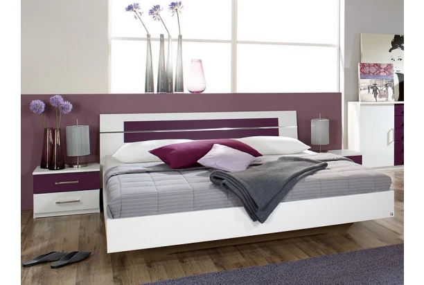Postel s nočními stolky o rozměru lůžka 160×200 cm z ložnicového programu Burano v kontrastní kombinaci bílá/fialová ostružina. Zadní čelo doplněno dekorativním pruhem v barvě lesklého chromu.