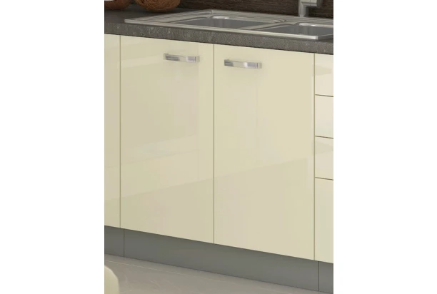 Kuchyňská dřezová skříňka o šířce 80 cm z programu Karmen v jednoduchém, funkčním a zároveň moderním stylu. Přední plochy v krémovém vysokém lesku. Různé elementy kuchyňského programu Karmen můžete mezi sebou libovolně kombinovat a sestavit si tak libovolně velkou kuchyni podle vašich individuálních potřeb a prostorových možností.