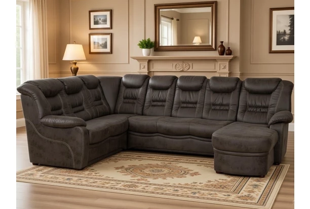 Velmi oblíbená sedací souprava s půdorysem do U vyniká svou prostorností a komfortně vysokým opěrákem. Očalouněna látkou v optice strukturované kůže v odstínu čokoládově hnědá. Prostorná sedačka s výrazným proševem a otomanem na pravé straně poskytne pohodlí pro celou rodinu. Varianta sedačky bez relaxační funkce sklápěcího opěradla, bez zásuvky a rozkladu.