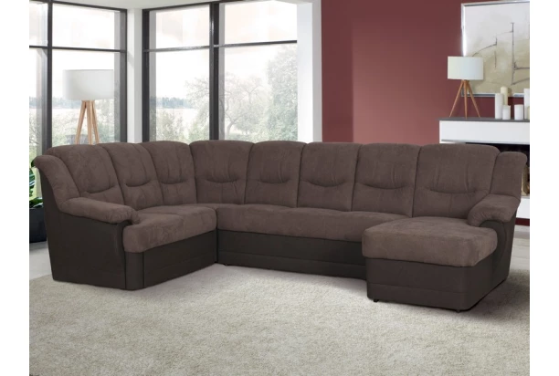 Zaoblené tvary, prostorné sezení a vysoký opěrák jsou charakteristické pro model sedačky Orion. S půdorysem do tvaru U, potahem v šedo-hnědé kombinaci tkaniny a ekokůže a navíc funkcí rozkladu.