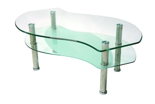 Skleněný konferenční stolek na kovových nohách v barvě lesklého chromu. Horní i dolní tvarování desek v zajímavě zaoblených tvarech.