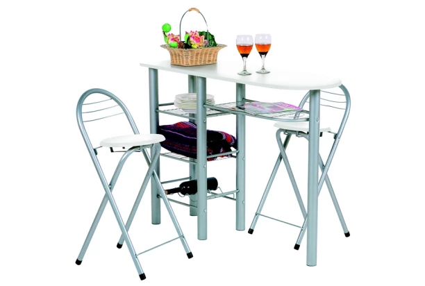 Malá jídelní souprava, skládá se ze stolku s 2 židliček. S několika odkládacími policemi. V bílé barvě.