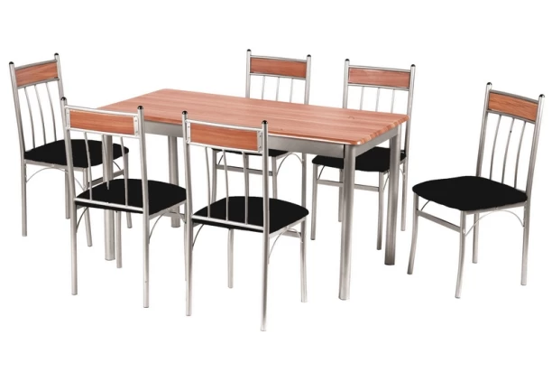 Kompletní jídelní souprava až pro šest lidí. Ocelová konstrukce kombinovaná dekorem tmavý ořech.