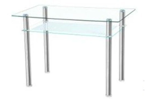 Menší jídelní stůl v kombinaci lesklé oceli a čirého tvrzeného skla. Se spodní odkládací deskou zdobenou proužky mléčného skla.