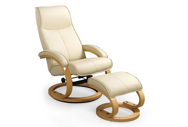 Luxusní relaxační křeslo na pevné konstrukci z ohýbaného dřeva. Sedací části potaženy ekokůží béžové barvy. Včetně podnožky pro lepší pocit při odpočinku.