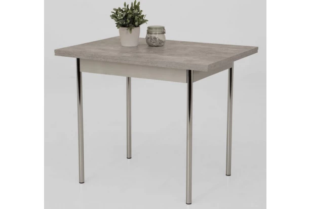 Malý jídelní stůl na kovových nohách skvěle poslouží v malém prostoru kuchyně nebo jídelny. Jídelní desku o rozměru 90×65 cm v imitaci šedého betonu můžete navíc rozložit a zvětšit tak její plochu.