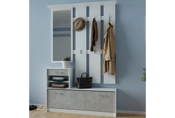 Sympatická sestava předsíňové stěny, která obsahuje vše potřebné. Vyrobena v imitaci šedého betonu v kombinaci s bílými plochami a dokonale doplní moderně zařízenou předsíň.