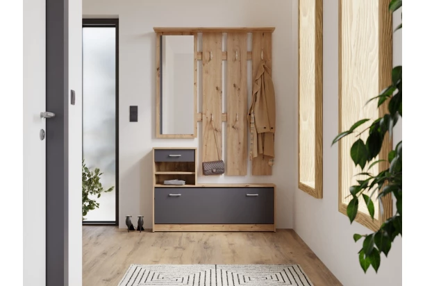Sympatická sestava předsíňové stěny, která obsahuje vše potřebné. Vyrobena v dekoru dub artisan v kombinaci s antracitovými plochami a dokonale doplní moderně zařízenou předsíň.