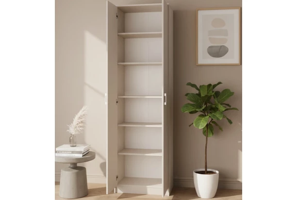 Úzká policová 2-dveřová skříň, která poslouží dobře v malých prostorech, ve spíži i jako botník. Vyrobena v kašmírově béžové barvě a dokonale doplní moderně zařízený byt.