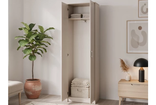 Úzká 2-dveřová skříň na kabáty, která poslouží dobře v malých předsíních nebo šatnách. Vyrobena v kašmírově béžové barvě a dokonale doplní stylově zařízený byt.