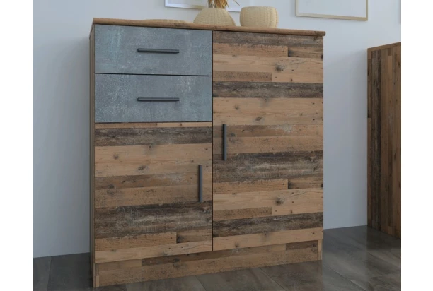 Komoda o šířce 79 cm z modelové řady Universal obsahuje 2 dveře a 2 zásuvky. Je využitelná v jakékoliv místnosti. Vyrobena v kombinaci tmavě šedého betonu s vintage optikou dřevěných prken – zaujme na pohled a dokonale doplní stylově zařízený byt.