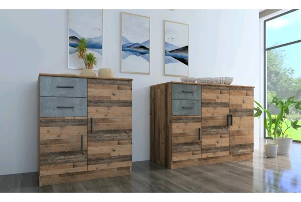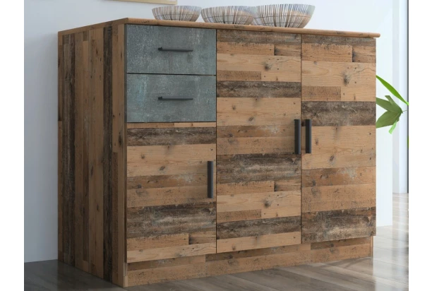 Komoda o šířce 118 cm z modelové řady Universal obsahuje 3 dveře a 2 zásuvky. Je využitelná v jakékoliv místnosti. Vyrobena v kombinaci tmavě šedého betonu s vintage optikou dřevěných prken – zaujme na pohled a dokonale doplní stylově zařízený byt.