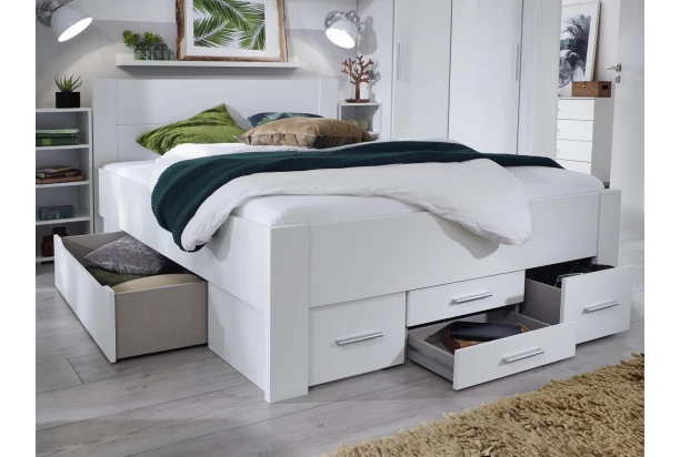 Praktická postel o rozměru lůžka 140×200 cm s maximálně využitým prostorem nabízí úložné zásuvky pro ukládání každodenních anebo sezónních věcí. V bílé barvě.