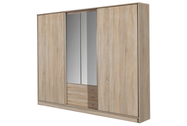 Šatní skříň o šířce 200 cm – kombinace posuvných dveří, otočných dveří, zrcadel a zásuvek prakticky poslouží a umožní přehledně ukládat ošacení i drobné prádlo. V dekoru dub sonoma.