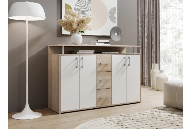 Úložná komoda v dekoru dub sonoma/bílá je navíc doplněna horní policí s praktickou širokou přihrádkou, kam si můžete odložit například věci každodenní potřeby a mít je tak vždy po ruce.
