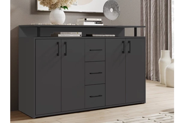Úložná komoda v barvě antracitová šedá je navíc doplněna horní policí s praktickou širokou přihrádkou, kam si můžete odložit například věci každodenní potřeby a mít je tak vždy po ruce.